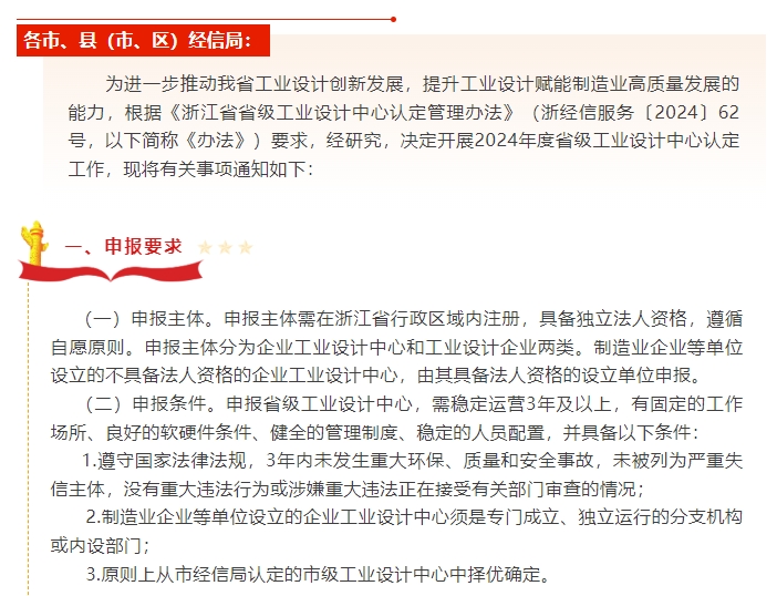各市、縣(市、區(qū))經(jīng)信局: 為進(jìn)一步推動我省工業(yè)設(shè)計創(chuàng)新發(fā)展,提升工業(yè)設(shè)計賦能制造業(yè)高質(zhì)量發(fā)展的能力,根據(jù)《浙江省省級工業(yè)設(shè)計中心認(rèn)定管理辦法》(浙...