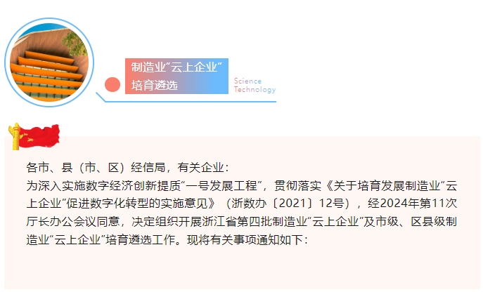各市、縣(市、區(qū))經(jīng)信局,有關(guān)企業(yè):為深入實(shí)施數(shù)字經(jīng)濟(jì)創(chuàng)新提質(zhì)“一號發(fā)展工程”,貫徹落實(shí)《關(guān)于培育發(fā)展制造業(yè)“云上企業(yè)”促進(jìn)數(shù)字化轉(zhuǎn)型的實(shí)施意見》(浙數(shù)辦〔2021〕12號),經(jīng)2024年第11次廳長...