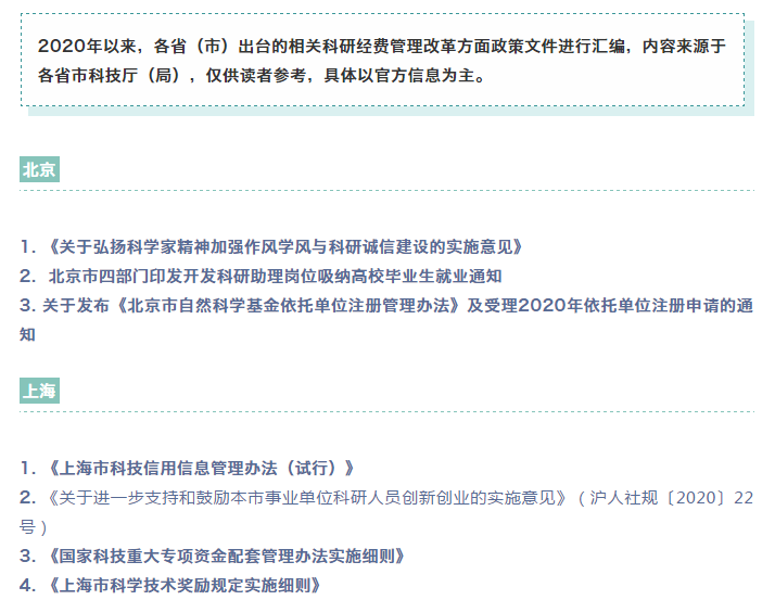 2020年以來,各?。ㄊ校┏雠_的相關科研經費管理改革方面政策文件進行匯編,內容來源于各省市科技廳(局),僅供讀者參考,具體以官方信息為主。北京1. 《關于弘揚科學家精神加強作風學風與科研誠信...